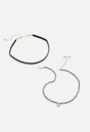 Both of these chokers are super cute! The black one has some silver glitter shimmer to it which is hard to see in the photo, and the gray one has a rhinestone drop. They are both versatile, I have been wearing them with casual and dressy clothes. I bought these because I only wanted a couple of chokers in my jewelry collection that I could wear with anything. If you're wanting to do the same, then this is the set you need!